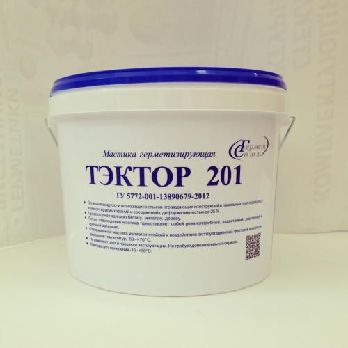 ТЭКТОР 201 предназначен для герметизации стыков строящихся и ремонтируемых зданий. Рекомендуется к применению на швах средней деформативности. После вулканизации представляет собой резиноподобный материал. Относительное удлинение в момент разрыва не менее 500%. Производство ООО «Герметсоюз».ТУ 5772-001-13890679-2012