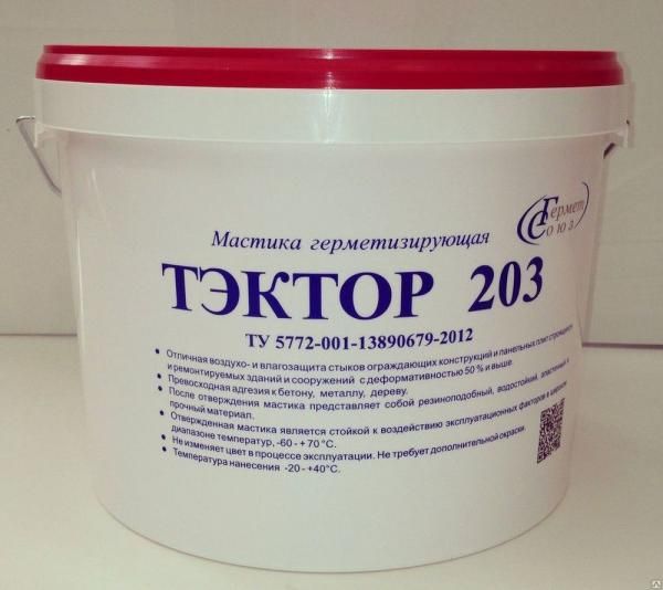 ТЭКТОР 203 предназначен для герметизации стыков строящихся и ремонтируемых зданий. Рекомендуюется к применению на швах с высокой деформативностью. После вулканизации представляет собой резиноподобный материал. Относительное удлинение в момент разрыва 600%. Производство ООО «Герметсоюз». ТУ 5772-001-13890679-2012.